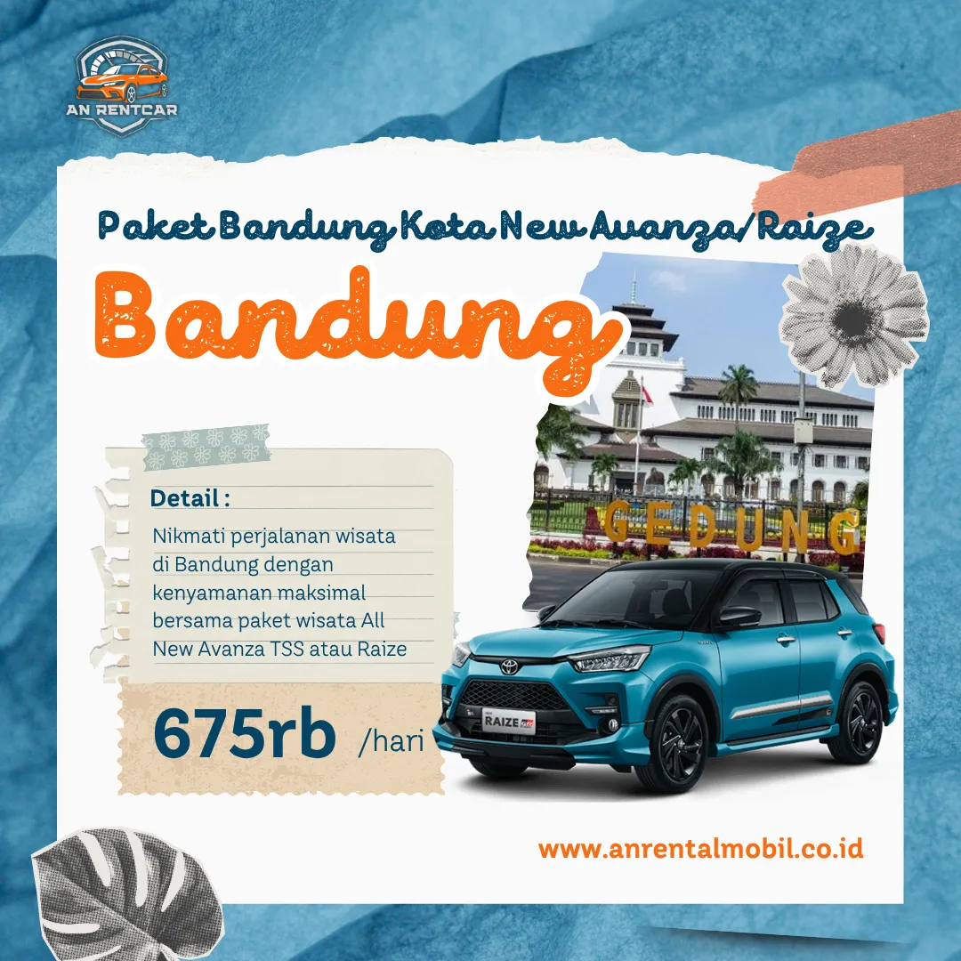 Nikmati perjalanan wisata di Bandung dengan kenyamanan maksimal bersama paket wisata All New Avanza TSS atau Raize, lengkap dengan fasilitas mobil, supir, dan BBM. Dengan tarif terjangkau, paket ini memudahkan perjalanan Anda tanpa harus repot mengatur transportasi sendiri. Baik untuk wisata keluarga atau acara bisnis, paket ini siap mengantar Anda ke destinasi populer seperti Lembang, Dago, dan pusat kota Bandung.